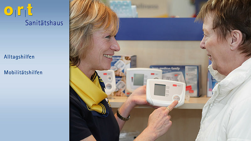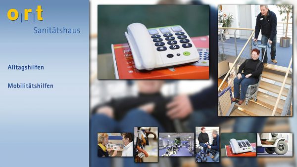 o|r|t Sanitätshaus produziert regelmäßig hochwertige Fotos von allen wichtigen Produkten und Dienstleistungen. Diese Bilder wurden zu ansprechenden und lebendigen Fotoshows zusammengestellt, die eigenständig auf Großbild-Monitoren oder Beamern ablaufen können. Full-HD und sorgfältige Bildbearbeitung gewährleisten optimale Bildqualität.
