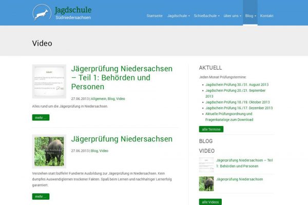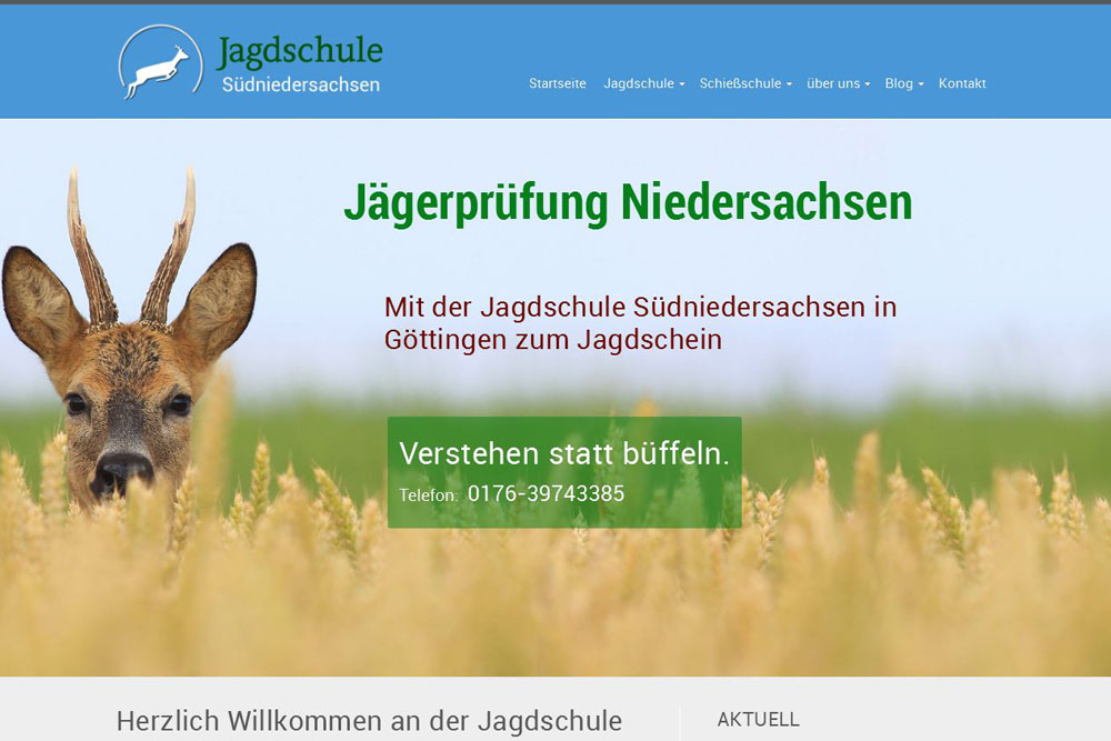 Die neugegründete Jagdschule Südniedersachsen benötigte eine Website zur Darstellung ihres Leistungsspektrums und als Plattform für die Publikation multimedialer Inhalte rund um die Themen Jagd und Jagdausbildung. Die Anforderungen waren: modernes, schlichtes Design, übersichtliche Navigation und einfache Pflege der Inhalte.