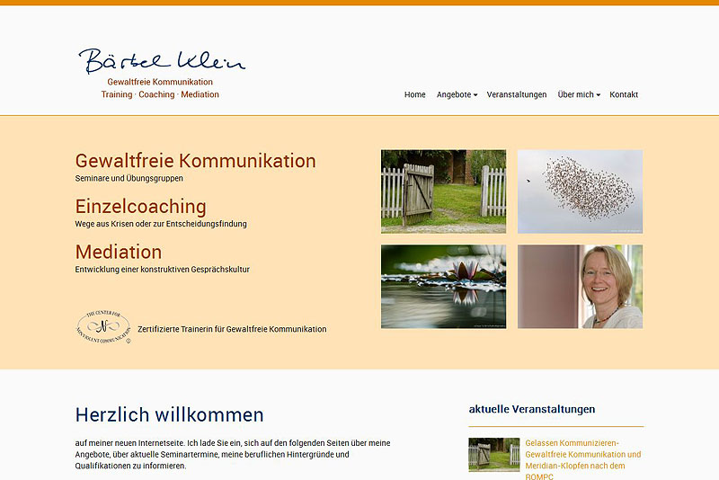 Die Kommunikationstrainerin Bärbel Klein aus Göttingen benötigte eine neue Internetpräsenz. Zusätzlich zur kompletten Gestaltung sollte auch ein einfach zu bedienendes Content-Management-System implementiert werden, um die Inhalte zukünftig selbst pflegen zu können. Neben einer ausführlichen Darstellung der eigenen Beratungs- und Trainingsangebote sollten vor allem auch Seminare und Veranstaltungen gut sichtbar und ausführlich präsentiert werden.