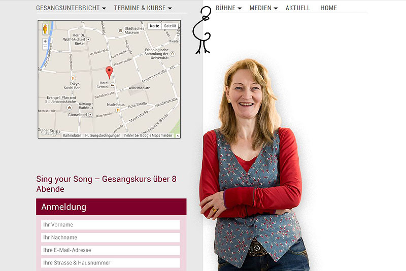 Als Grundkonzeption wurde eine klare Aufteilung der Seite in die beiden Arbeitsbereiche entwickelt: Alle Inhalte des Bereichs „Gesangsunterricht“ stehen in der linken Hälfte, alle Inhalte des Bereichs „Bühne“ in der rechten Hälfte. Aus diesem Konzept entstand eine gleichermaßen einfache wie interessante Gestaltung, die durch große Fotos ihre jeweils passende emotionale Aussage erhält.