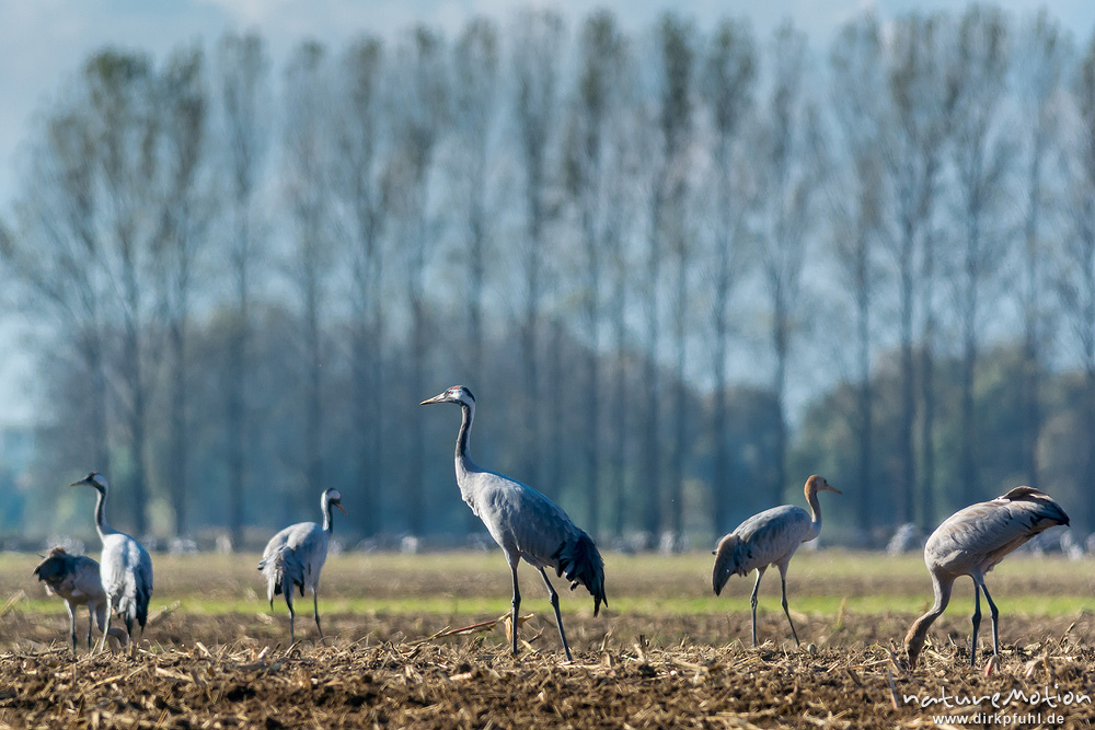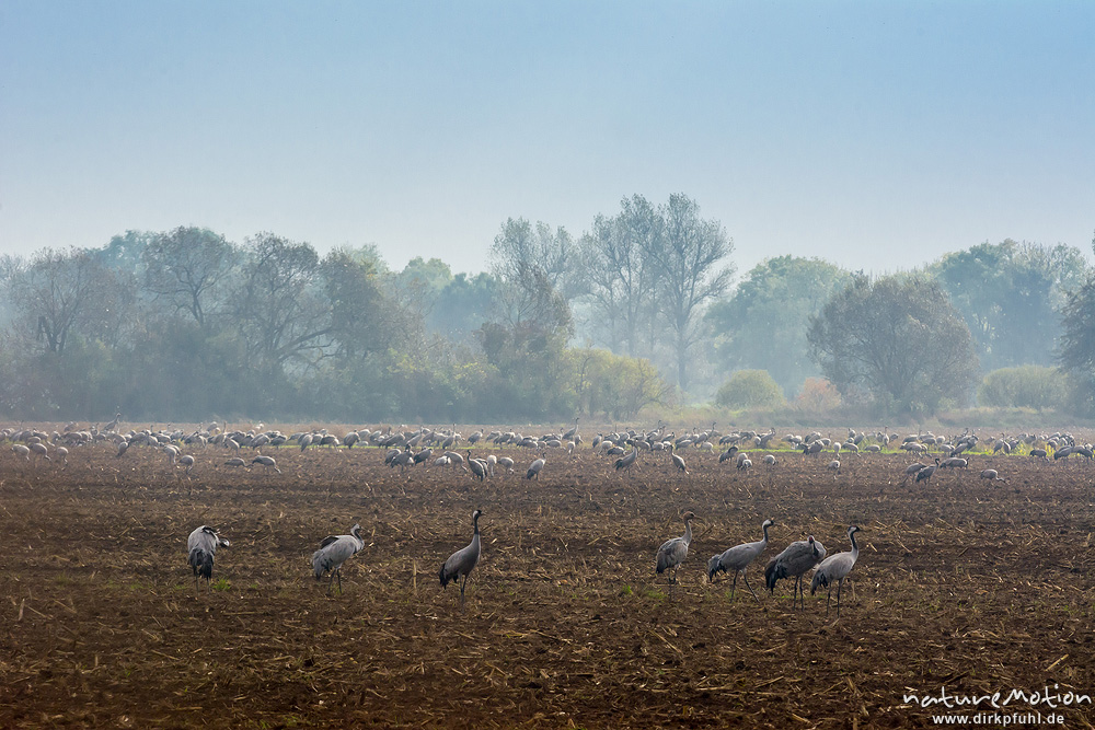 Ich war nun allerdings mit der Bahn angereist und im Gebiet mit dem Fahrrad unterwegs. Sobald die Kraniche eine menschliche Silhouette in ihrer Nähe entdecken, gehen sie auf Abstand. Die Fluchtdistanz betrug hier etwa 100 Meter. Mit Geduld und vorsichtigem Anpirschen konnte ich jedoch immer wieder die Deckung der Gehölze nutzen und mich bis an den Rand der Felder vorarbeiten. Selbst wenn manche Tiere mich dennoch bemerkten und zunächst flüchteten, kaum eine halbe Stunde später wanderten die Kraniche zurück in den zuvor verlassenen Bereich. So waren Foto- und Videoaufnahmen aus Distanzen von 10 bis 15 Metern möglich, noch einmal erheblich näher also, als von der Straße aus und zudem nicht erhöht und damit auf Augenhöhe mit den Tieren.