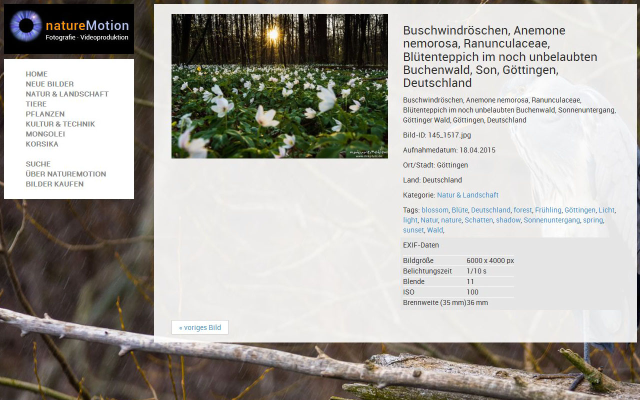 Ein Button „Bilddaten“ öffnet das Bild auf einer einzelnen Seite. Hier werden alle Metadaten ausgegeben: Bildtitel, Beschreibung, Aufnahmeort und -Datum sowie technische Daten wie Bildgröße, Belichtungszeit usw. Suchmaschinen wird damit für jedes Bild eine Einzelseite mit allen Bildinformationen und Metadaten angeboten, so dass auch bei Bildsuchen über Google & Co natureMotion eine gute Platzierung erreicht.