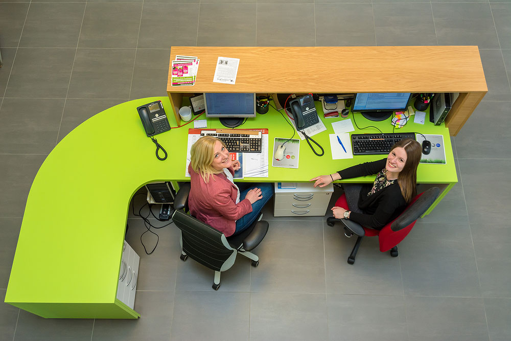 Gebäude und Menschen am Arbeitsplatz gehören natürlich zum Standardrepertoire eines Fotografen. Gefordert waren Bilder, die möglichst ungestellt und dokumentarisch wirken und dennoch wichtige Botschaften wie Kompetenz und Sympathie vermitteln sollten.