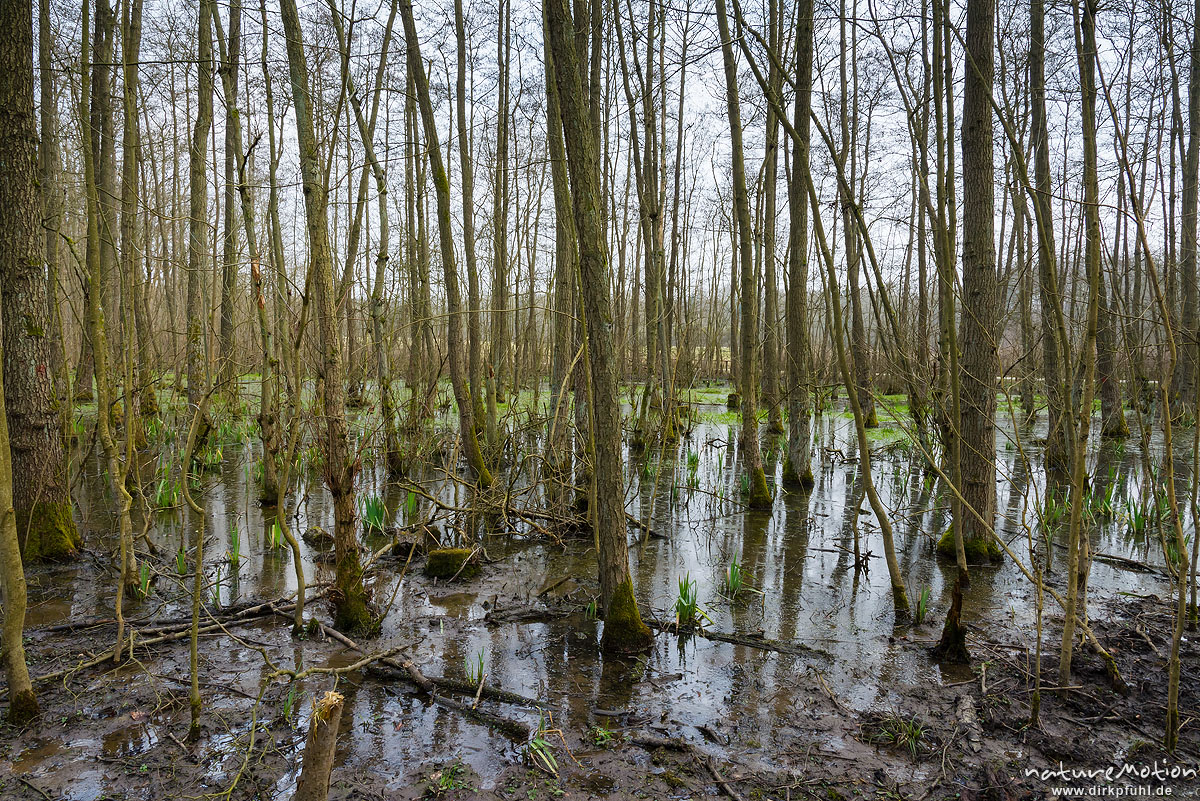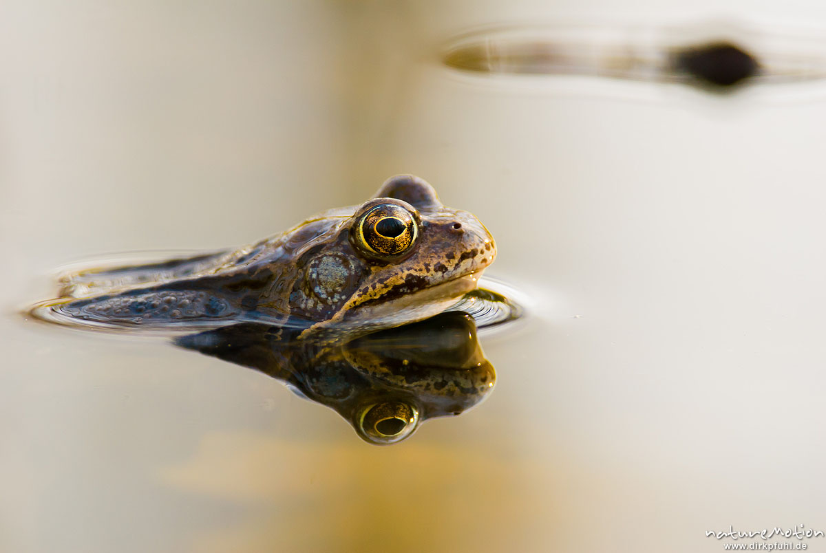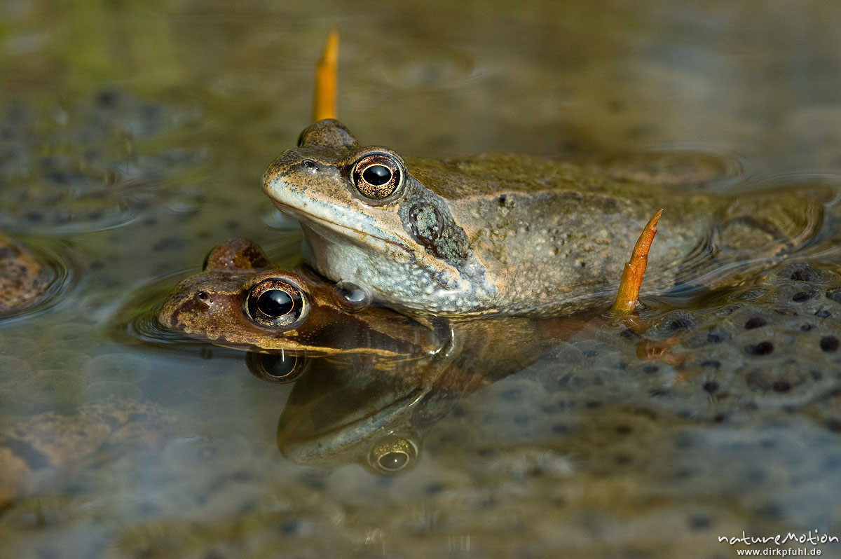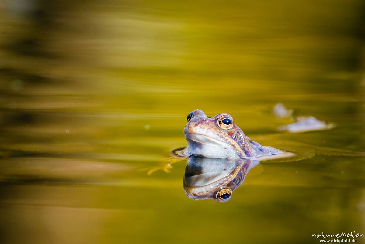 Seit 2003 verbringe ich jeden März einige Tage an einem Erlenbruch im Göttinger Wald. Sobald die Nächte frostfrei sind, wandern aus der gesamten Umgebung die Grasfrösche in das kleine Gewässer, um dort für Nachwuchs zu sorgen. Dann wimmelt es im Wasser von hunderten Männchen auf der Suche nach einem Weibchen und ihre andauernden Paarungsrufe vereinen sich zu einem tiefen Brummen, dass schon von Weitem zu hören ist.