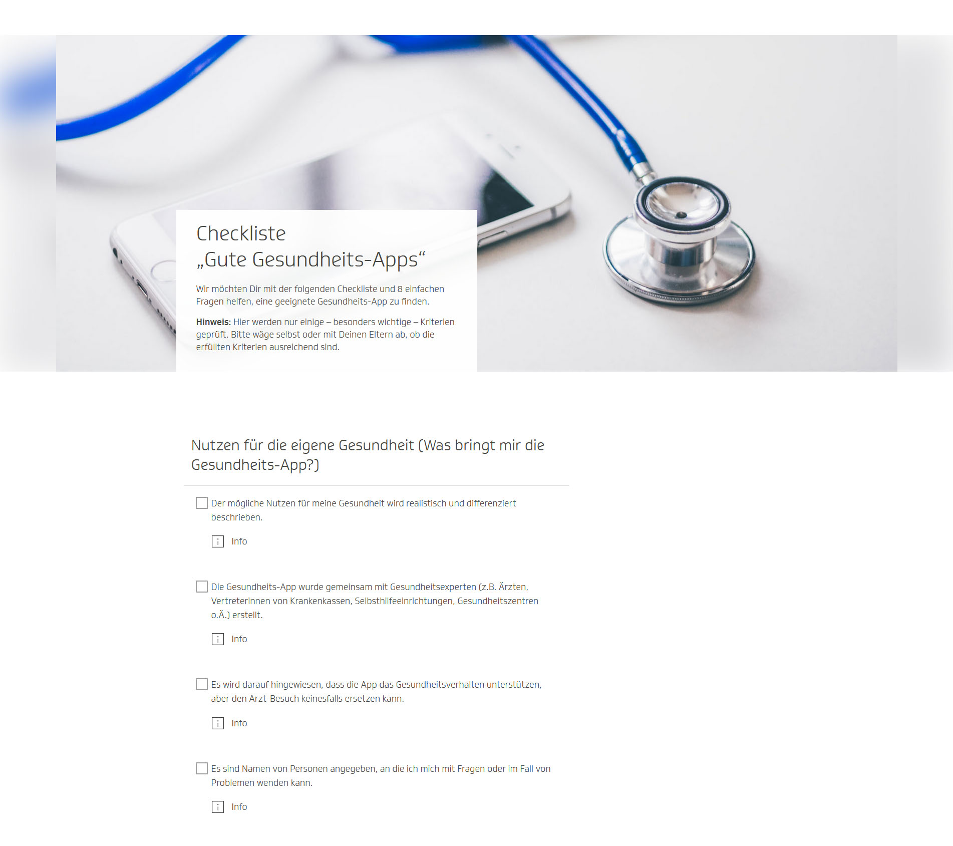 Es gibt eine Vielzahl an Gesundheits-Apps und eine geeignete Auswahl zu treffen, ist nicht immer ganz einfach. Die TK hat in Zusammenarbeit mit der APOLLON Hochschule in Bremen und dem Leibniz-Institut für Medienforschung in Hamburg eine Checkliste und einen Wissenstest erstellt, mit dem Jugendliche ihr Wissen über den Nutzen, die Qualität und die Sicherheit von Gesundheits-Apps überprüfen und erweitern können.