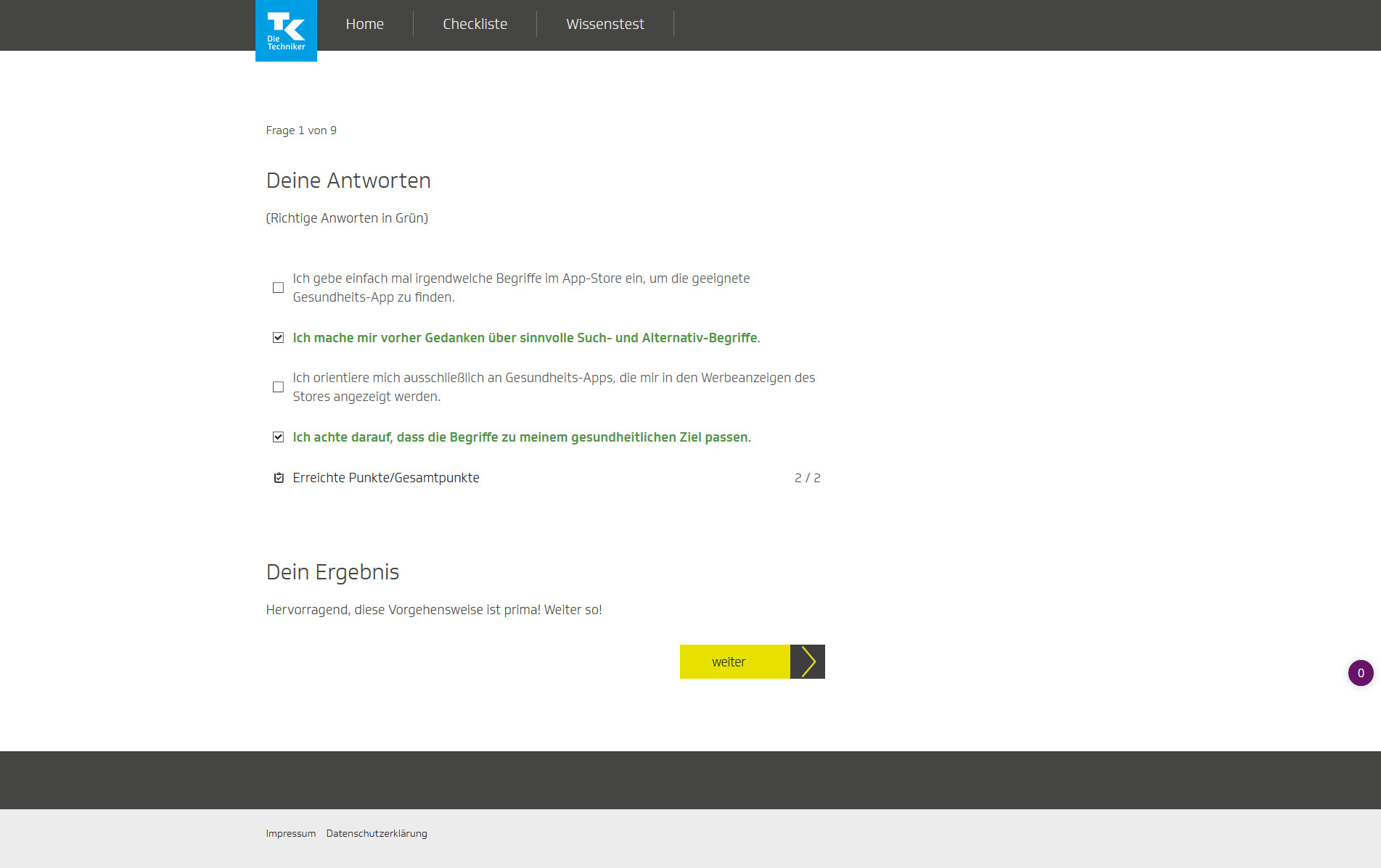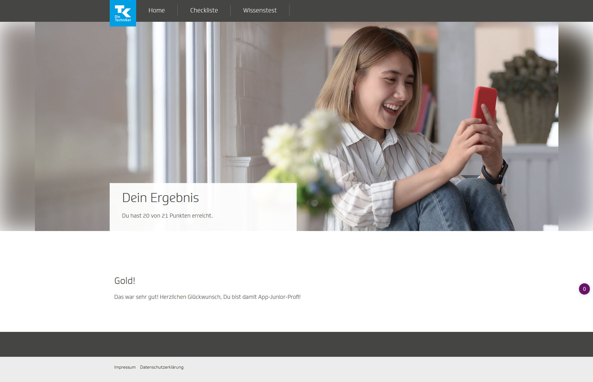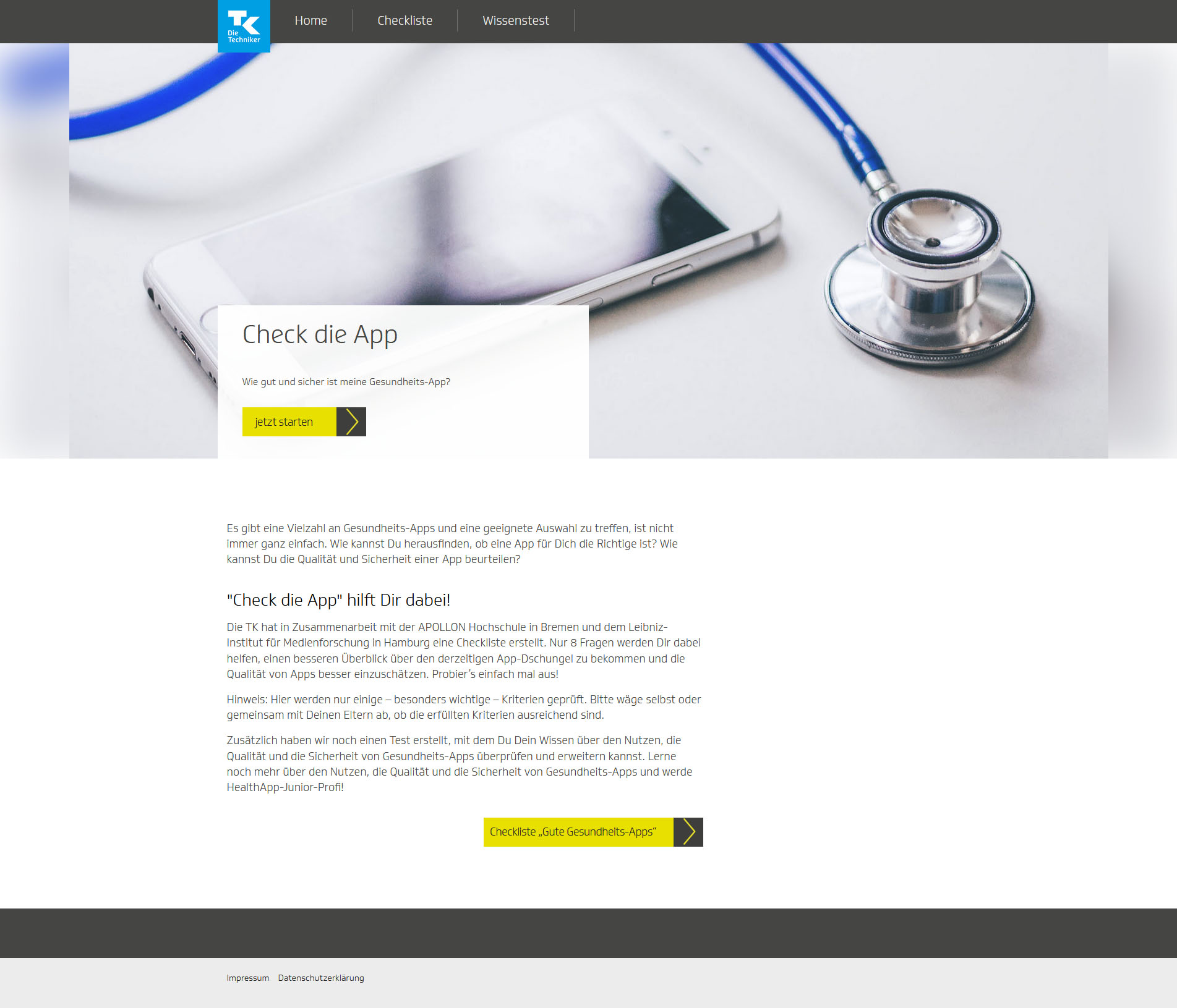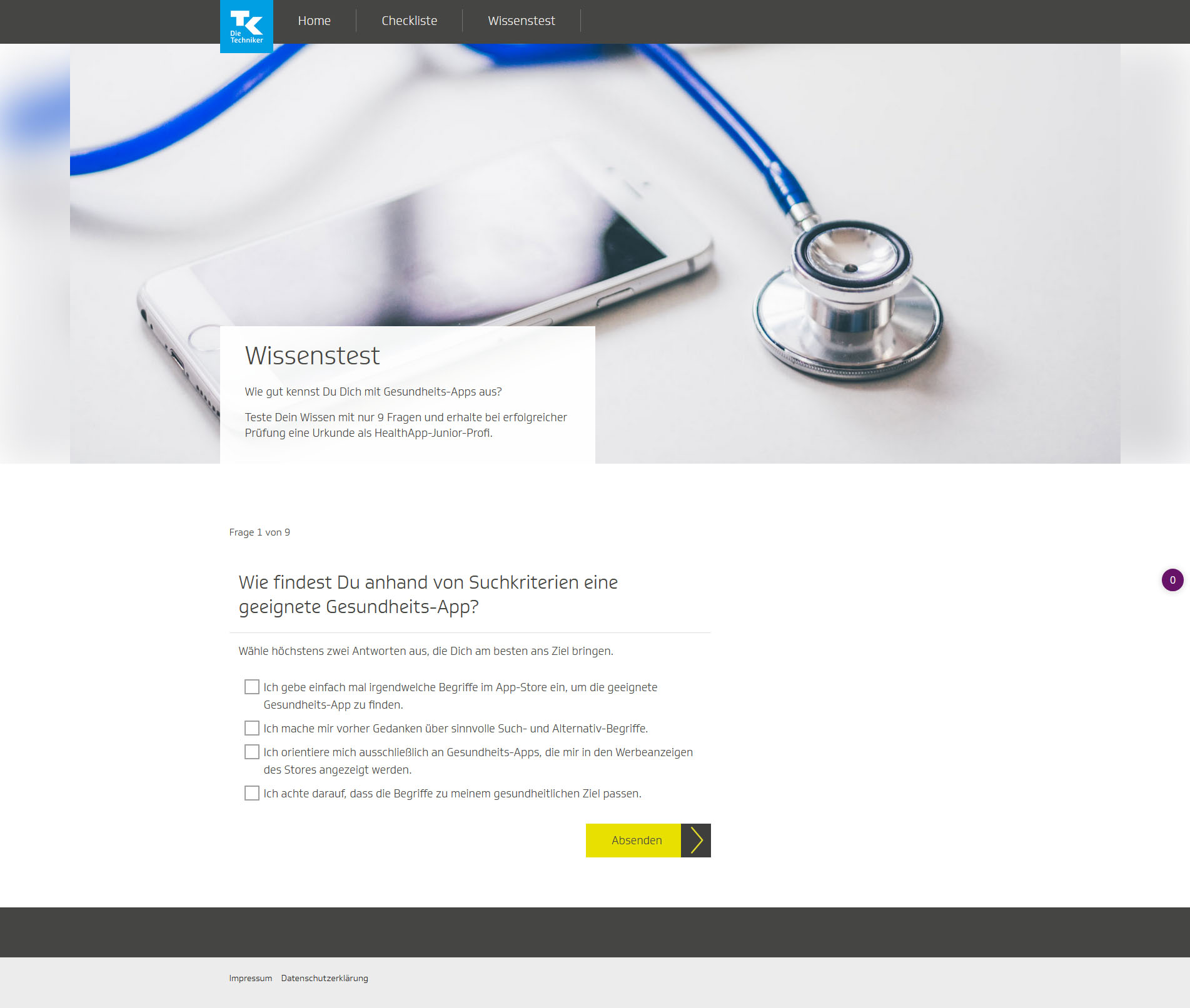 Checkliste und Wissenstest sollten als separate Website aber im Corporate Design der TK umgesetzt werden.